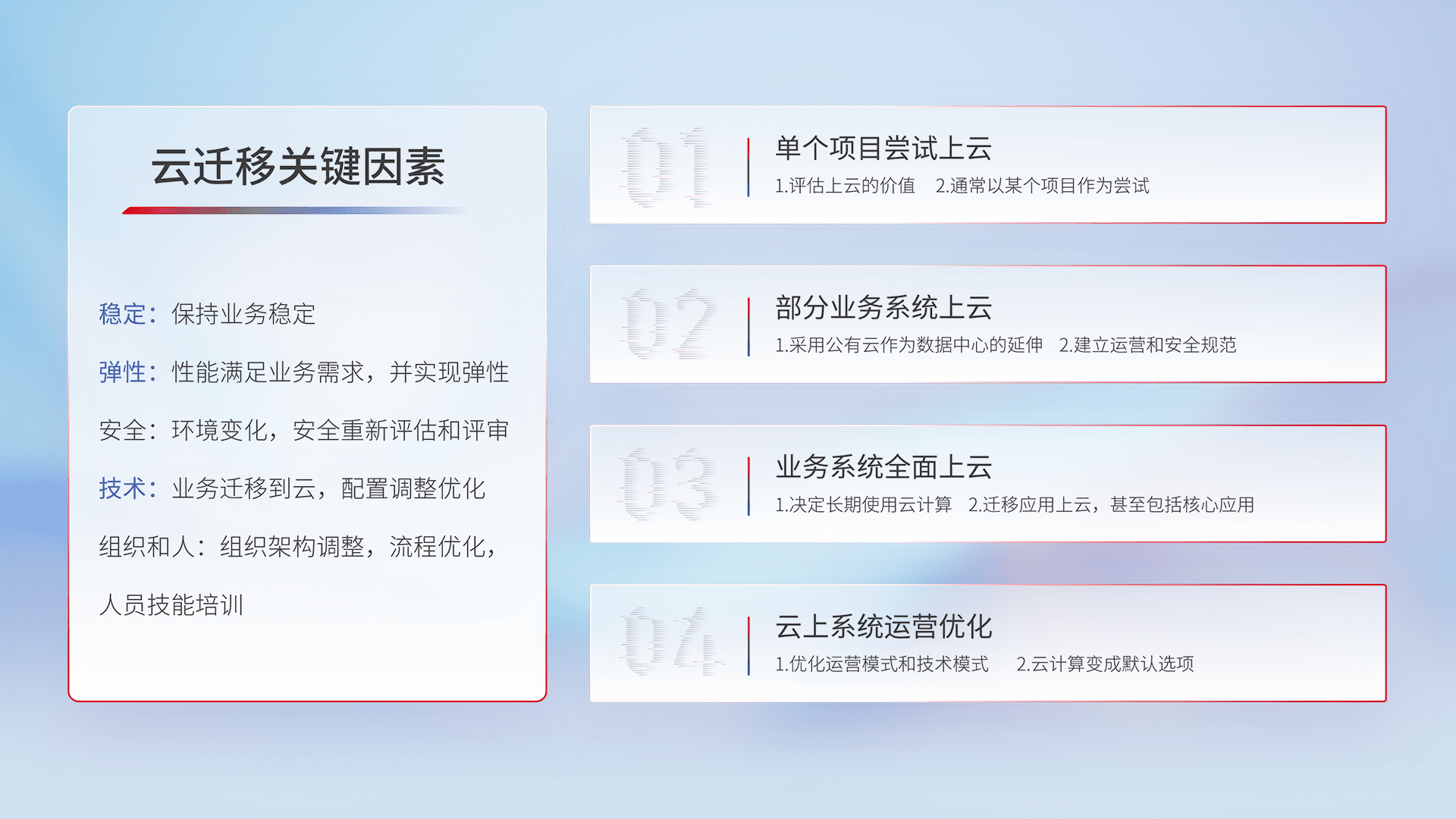 结合实际业务,,,从规划设计、、、、云平台选型、、云原生改造、、、、数据迁移、、、、集成交付,,,迁移全过程为客户识别最佳上云路径,,,做好风险识别管理,,,,设计网络架构、、、身份权限、、、安全审计合规、、操作审计、、、日志审计、、、、监控告警策略、、、、多站点容灾设计等,,对云上基础设施进行整体规划,,,提升IT治理水平,,,以满足弹性、、高可用、、高性能的需求。。。