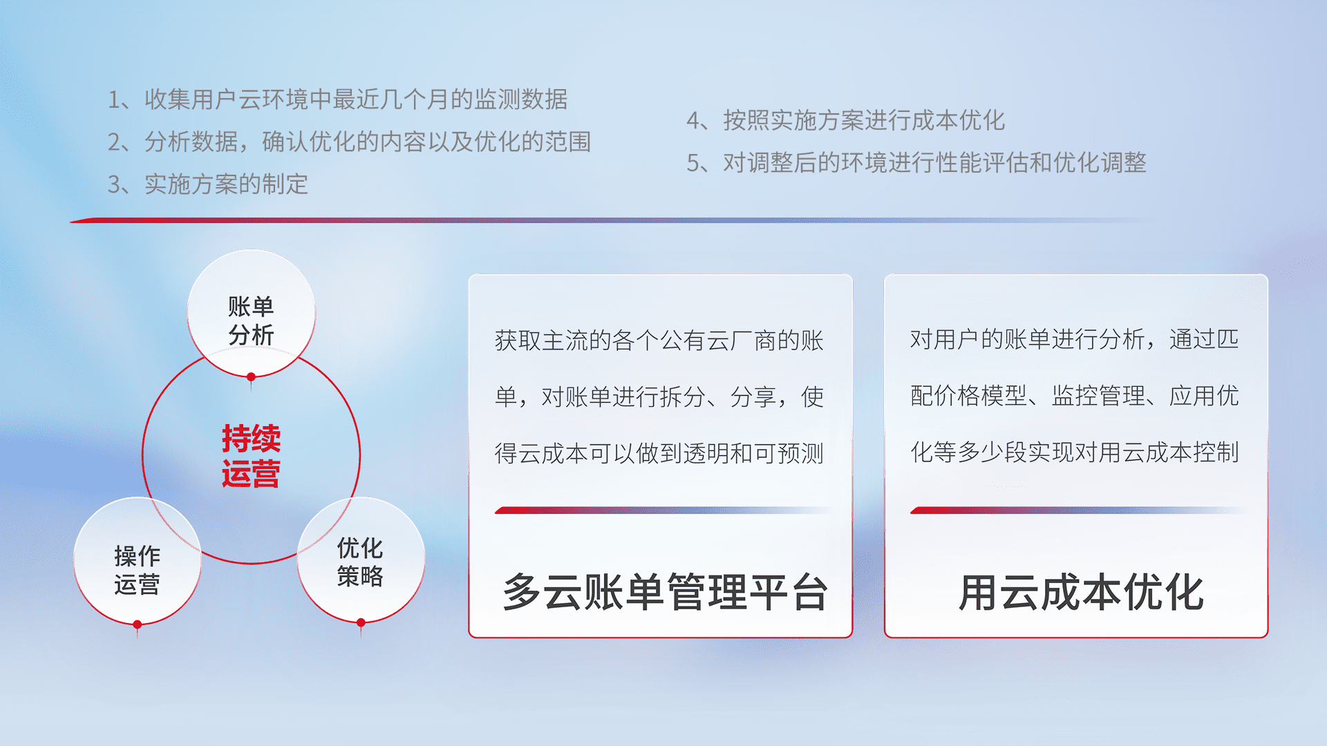 通过多云纳管,,,,以统一的资源数据模型把客户的云资源进行抽象和封装,,进而实现对多云资源的统一操作,,,保障云资源管理的可靠性、、、、稳定性与可用性。。。量身定制化运维内容,,配置、、开发运维、、、、补丁管理、、、备份、、监控、、、、认证和访问管理、、、、审计和日常巡检等,,,,保障在用云过程中的可靠度,,稳定度以及高可用率。。